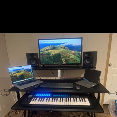 For me this was a budget buy, but now that I have received it, I realize this is an high quality desk. The online photos don’t do it any justice. It is bigger than expected with an awesome texture finish. The keyboard area fits my 49 key midi with plenty of room to go bigger if needed. The top shelf fits a 32 in tv with just enough room for my speakers. Assembly was fast and easy, only taken like 30 minutes to an hour for setup. The assembly instructions came with seven photos that were not difficult to comprehend. The only extra tool needed was a screwdriver, but packing came with screws and allen ranch. I would definitely recommend this to others with no questions asked.