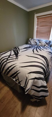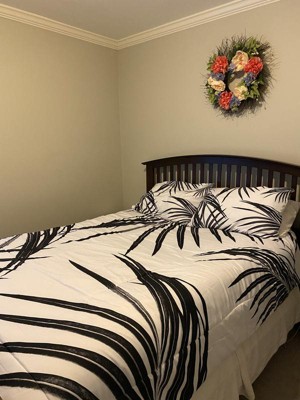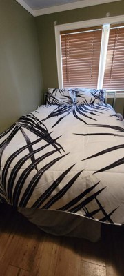 This is a lovely queen comforter set that comes with comforter and 2 pillow cases. It is black and white and will match all decor. It basically looks like black shadows of palm fronds on white. It's tropical but not overkill. It's fluffy and soft but the material is not very soft. It's basically your typical entry level comforter, great for a guest room or college kid starting out but I'm not sure I'd want it on my bed for everyday use since it feels like it's made for kids almost based on the quality if that makes sense. I would have loved it when I was younger but I've definitely become more discerning as I've gotten older. I plan to use in my guest room and it will be perfect there.