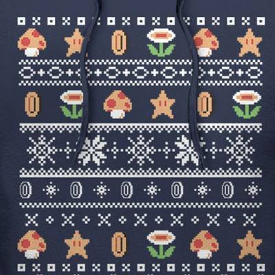 Win some Christmas points this year with the Nintendo Mario Points Ugly Christmas Sweater Men's Pullover Hoodie. Mushrooms, stars, coins, and more are printed in an ugly Christmas sweater style on this fun Nintendo pullover hoodie.