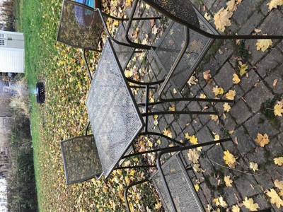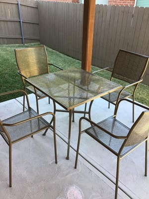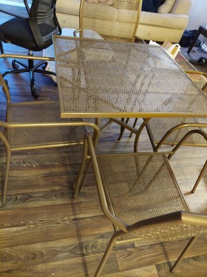 [This review was collected as part of a promotion.] I received this indoor/outdoor steel patio table set with 4 chairs. This set come in two boxes. One was the four chairs, which are all assembled and ready to be used. The table came in the other box and it does need to be assemble. The assemble was quick. It took about 15 minutes and that was only because I messed up and used the wrong washer to put the legs together. I ended up having to loosen that screw to get the wrong washer out and put the correct one in. The chairs and tables are fairly light in weights, so that you are able to easily carry it around as needed. The gold color does look a bit different than what is in the picture. The pictures shows the tablet set to be a shiny gold color but mine is more of a dull and dark gold color. I suppose it could be that I have been using the table and chairs on cloudy days, so it doesn’t have the shine from the sun like it should? The chairs doesn’t look like its very strong since it so light weight, but it held very well. The chair held 260lbs without any issues. The chairs are fairly comfortable and the table is sturdy. I just received the table and chair to test a few days ago and here in MN, its already fall. The temperatures are in the 40s and 50s here. The chair felt cold on your butt after sitting in it awhile. I will have to get some cushions for the chairs so that you can’t feel the cold chair. However, the cold chairs makes me wondering if in the summer, the chairs will be hot? I think that is possible, so chair cushions would be a great additional to these chairs. I like that the chairs can be stacked for storage when not in uses.