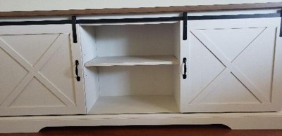 Saracina Home’s Clarabelle Double Sliding X Barn Door 70” TV Stand is the homey farmhouse pick-me-up you’ve been looking for. Two sliding X-front barn doors give you the freedom to choose what’s on display and what stays out of sight. Place media components, books, and decorations on any of the three adjustable shelves, and keep cables organized with the convenient cord management ports. Strong powder-coated steel hardware and accents add just the right amount of rustic finesse to the piece. The low profile makes for a down-to-earth silhouette that looks just right as a living room storage console or even a dining room sideboard.