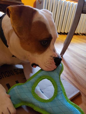 This is a super durable dog toy that will last a long time. I have two large Boxers and they have had fun with it playing tug of war and they each can hold onto one of the sides. Really like that it won’t be destroyed in a day.