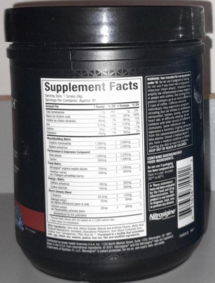 musclebuilding matrix, performance & endurance compound, pump matrix, energy + matrix, neuro-sensory blend. other ingredients: citric acid, silicon dioxide, natural and artificial flavors, malic acid, resistant maltodextrin, sucralose, acesulfame-potassium, gum blend (cellulose gum, xanthan gum, carrageenan), fd&c blue 1.