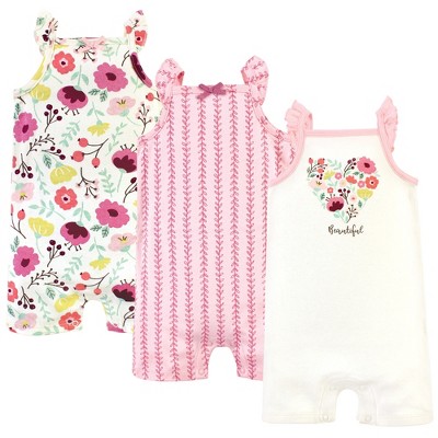 Touched by Nature is an organic cotton brand with beautifully designed clothing, bibs, blankets, hair accessories and socks made of premium organic cotton fabric. Organic cotton feels super soft on skin as the fibers are natural and breathable. Organic cotton is made without the use of synthetic pesticides and fertilizers, so it is an environmentally-friendly alternative compared to traditional farming methods. Touched by Nature rompers are an essential part of baby's wardrobe. Our cotton rompers feature adorable prints, embroideries, stripes and solids and are comfortable one-piece clothing for your little one. Our rompers are comfortable and cozy for all-day, everyday wear and great for warmer temperatures. Touched by Nature Baby Girl Organic Cotton Rompers 3pk, Strawberries is a great baby essentials set for your little one.