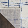 With its abstract linear design and lightly distressed accents, this area rug from the Whimsicle Collection adds a distinctively sleek and modern touch to your living room, bedroom, dining room, or home office. A neutral palette of blue, grey, and ivory easily complements any style of decor. This cool and contemporary design is machine made of low profile, easy to clean polyester fibers.
