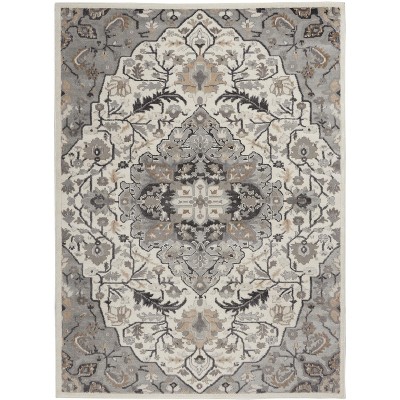 - Unique area rug design in grey, beige, brown, and ivory hues are a chic foundation in living room, bedroom, or home office