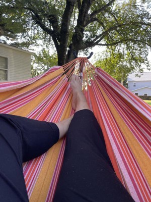 - BUILT TO LAST: Weather-resistant hammock is made from a tightly woven cotton blend that easily folds into a compact carrying bag so you can take your comfort on the go!; OVERALL DIMENSIONS: 98"(L) x 59"(W); Weight Capacity: 450 lbs.