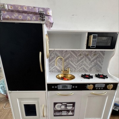 This kitchen is absolutely beautiful. It is very modern and I love the gold features. Putting it together was definitely a headache because I’m not good at putting things together, but it was a two person task and we got it together and probably 2 1/2 hours on Christmas Eve. The directions were pretty straight forward. The kids absolutely love it. My five year old is the perfect size for her (even though I hoped it would be a lot bigger. There’s a refrigerator and oven and places to store the food. Definitely a great buy. 8 months later and it’s still extremely sturdy.