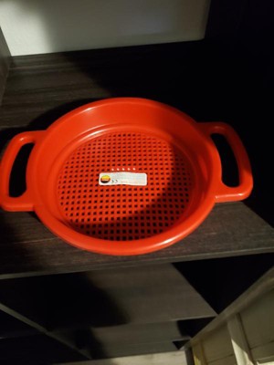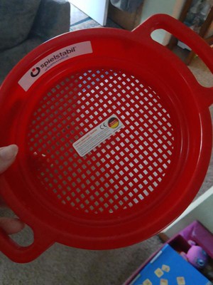 [This review was collected as part of a promotion.] My Review for Sand Sieve Large (assorted colors) we received the red one my little girl loves it. She puts dirt in it and shakes it to get the rocky stuff. She also uses it in the pool too with water like a shower head