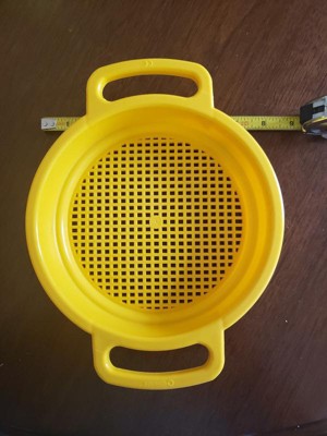 [This review was collected as part of a promotion.] This flexible and durable sand sieve measures 10" handle to handle, 8" across the sieve pan, and is 1.5" deep. Color options vary and can be blue, red, or yellow. We frequently go mining for shark teeth in the sand/water and this will allow my little ones to play with a durable sieve and find some teeth. We plan on ordering the bucket for them so they can use the two together. I like that the sieve seats into the bucket. The kiddos' hands easily fit into the handles and it is sized perfectly for use. This would be great to use any place there is sand: the beach, a park, sandbox, etc. and is guaranteed to provide hours of fun. I like that this is BPA- and phthalate-free. Highly recommend.