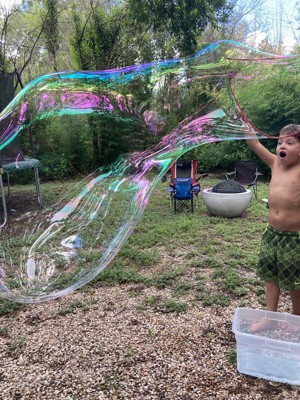 [This review was collected as part of a promotion.] This bubble kit is a blast! It makes huge bubbles easily! We got a bucket, filled it with 32oz water and one bubble solution packet and instantly had so much fun! My kids and I were amazed! I appreciate the quality of the materials the handles and the rope that make up the wand are made out of too….I feel like we will get a lot of life out of it because it’s not a cheapo flimsy wand! I think the attached pic of my sons face says it all!