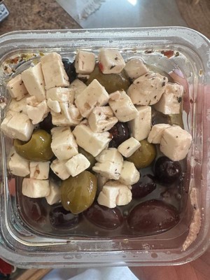 [This review was collected as part of a promotion.] These olives and feta are delicious! I buy this type of product all the time but this one was much better than I usually get. The olives are nice and firm, not mushy. I love it!