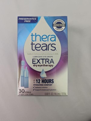 [This review was collected as part of a promotion.] Thera tears are eye drops used to lubricate the eyes when you have extremely dry eyes. This item is preservative free and the active ingredient is sodium carboxymethylcellulose. This product is very easy to use and comes in plastic vials that you twist the top off and squeeze into your eyes. It works well and does not burn. My eyes were not dry for the whole day after using this product. The box contains 30 sterile single-use vials and they are prepackaged in packets containing 5 vials. I would say this box is a month supply.