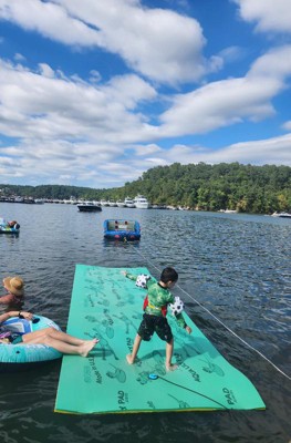 [This review was collected as part of a promotion.] We have access on big lake and all of my family members enjoy using this pad on the weekends. It is huge and heavy but my husband and I can hold it together and put in the truck. Kids are very happy jumping from it as well as laying on it. It can hold whole family of five. Great quality, very good materials, cool colors, easy to buckle it for grounding it.
