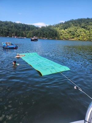 [This review was collected as part of a promotion.] Aqua Lily Pad 18 Ft Long Water Mat Playground Floating Foam Pad for Lake, Yellow Is perfect for a day at the lake. Made in the USA! Perfect for our family and friends! Floats well, easy to roll up and store. Perfect for fun in the sun! Easy to unroll and use. It rolls up great to toss on back of boat for middle of the lake adventures and is great to play on near the shore Durable and holds a good amount of weight! This is an awesome floating lily pad! Very durable and non abrasive! I highly recommend for Summer fun!