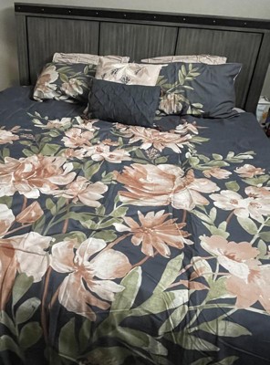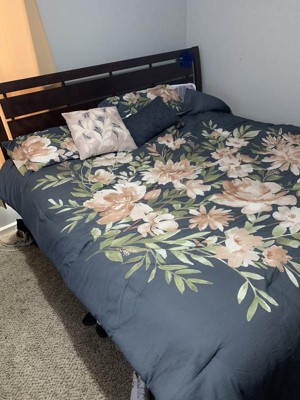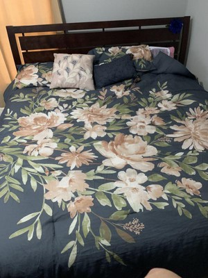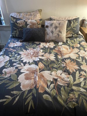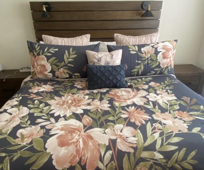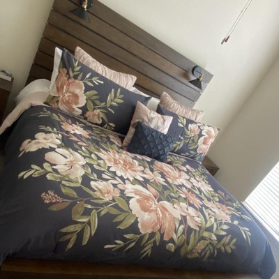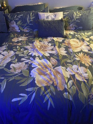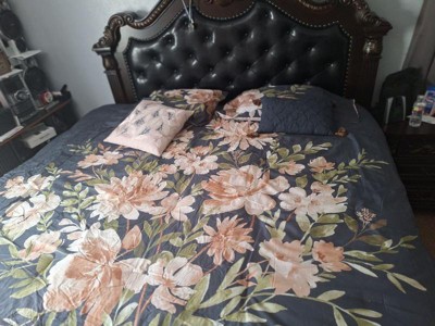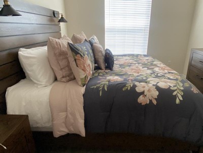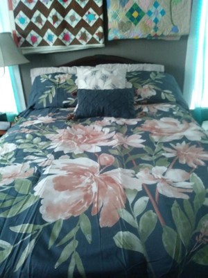 [This review was collected as part of a promotion.] This is a very nice set it comes with 8 pieces the comforter is very soft and very comfortable. Easy to wash .. gentle cycle with cold water and low tumble to dry after washing the comforter did not bunch up at all after washing. The coloring is very nice , navy with floral features. I have pets that like to get in the bed and the hair wipes right off it does not stick to the material. The comforter fits great with adequate overhang. It comes with two decorative pillows which are quite nice.The pillow cases are very soft, and the shams add extra decor.. A solid bed-skirt is also included this also fit perfectly. overall and excellent set it fit the decor of my bedroom perfectly, I usually do not care for floral patterns but this one is very nice.