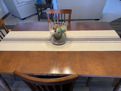 [This review was collected as part of a promotion.] I think this is a super cute, neutral color. I have gray walls and it matches well.Can be dressed up with a different centerpiece. Washes well under gentle cycle , needed iron tan over it a bit to get wrinkles out but held up well. Fabric is not thin like all other runners I've looked at , & don't collect cat hair lol my cats love to be on my table.
