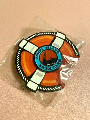 - Enamel Amity Island Swim Club pin on cardboard life preserver backing.