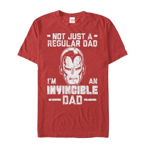 Your dad isn't an average joe…because he's a superhero to you with the Marvel Iron Man Father's Day Not Regular Dad Red T-Shirt! A distressed white graphic portrays Iron Man with the slogan "Not Just a Regular Dad. I'm an Invincible Dad" across the front of this cool red Iron Man shirt.