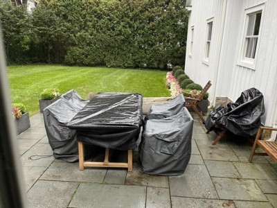 These are great for arms chairs, plenty of room and the water beads off nicely. They are roomy and have clips to secure the covers around chair legs to prevent them from blowing away. They also have two draw string cords on each one. It took a minute to figure out which way to put them on the chair, but once I’d done one it was a breeze.