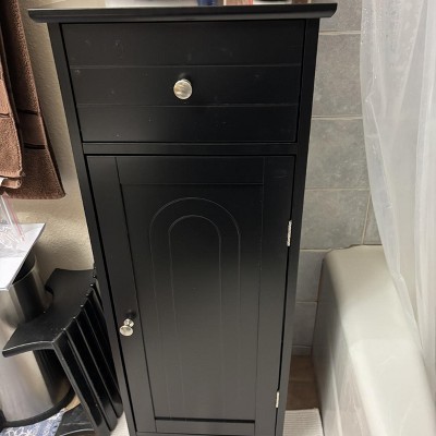 Love this cabinet in my bathroom. I needed a small cabinet and this fit perfect. The only problem is since I put it together it smells. I don’t know if it’s the material that smells or what but I smell it in three of my rooms. It’s a really strong smell in bathroom. I’m hoping that in a few days the smell vanishes.