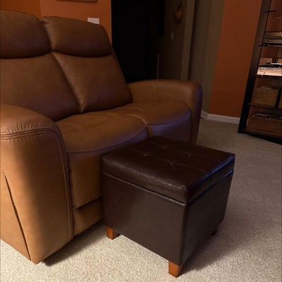 Ottoman is well made, and with the wooden feet, it’s the perfect height. The storage is a bonus, and easy to open. Looks great