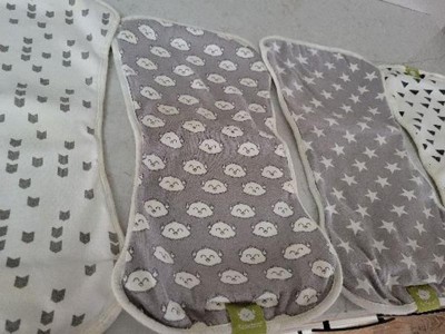 These are my favorite shoulder burp cloths! They rarely fall and absorb quite a bit. They shrink when you wash them the first time (always cold water and low heat but happens anyway!) But they still function well. We have 4 different patterns!