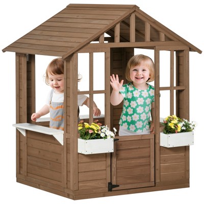 Outsunny Outdoor Playhouse for kids Wooden Cottage with Working Doors Windows & Mailbox, Pretend Play House for Age 3-6 Years
