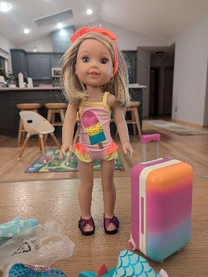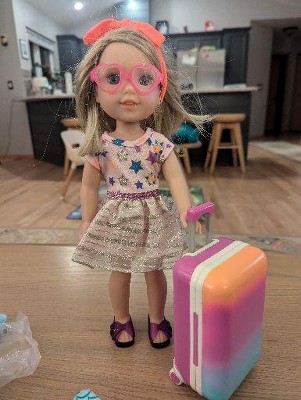 Discover fun adventures in bright styles with the Glitter Girls Suitcase & Fashion set for 14-inch dolls! Pack for dazzling journeys with the colorful suitcase as you prepare for trips around the world. It opens to fit all 3 stylish outfits, and it features rolling wheels to easily travel to your favorite spots. Dress for the beach with the cute ice-pop-print swimsuit and add the stylish hair bow accessory for a splash of fun. Or plan for a party in the star-print dress with the matching jelly sandals and heart-shaped glasses! When it’s nighttime, change into the comfy rainbow pajamas to keep cozy, then pack up the suitcase and travel to more sparkling destinations – the Glitter Girls World is always filled with wonder! (Dolls sold separately)