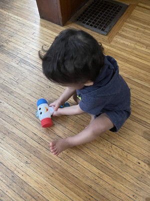 This is an amazing toy. It makes fun noises that little ones like when they hit anything with it – – even a kitchen pan. I put off getting it because it didn’t look like a regular hammer. I shouldn’t have done that. It’s much better than a more traditional plastic hammer for a nine month old and beyond.