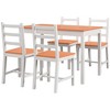 Create the perfect dining experience with this kitchen table and chairs set for 4 people. Clean lines and angles, large flat surfaces, and tall slatted seating come together to create this eye-catching, wood dining set that includes a solid table and four high back, slatted dining chairs. The solid pine wood construction provides support for up to 264lbs on the table and 176lbs per chair in a durable, sleek design. This kitchen table set is perfect for using in a compact kitchen .
