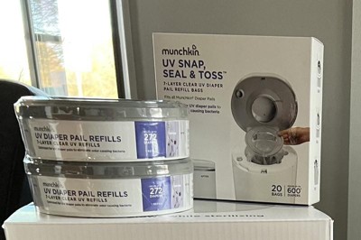 UV Snap, Seal & Toss Diaper Pail Refill Bags work great for the munchkin UV diaper pail. They snap right in and are effective to hold a reasonable amount of diapers. If you're looking for a single bag to hold a sizeable amount of diapers, these will be perfect.. The 7 layered bags work great with keeping the smell down along with the spin closure that the diaper pail has. Each bag holds approximately 30 diapers and the refills include 20 bags. I did receive this product in exchange for my honest feedback.