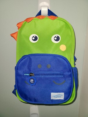 This is the perfect size backpack for a toddler/preschooler. It can easily fit a change of clothes, diaper, snack and a little toy. The front pouch can hold ID and smaller items like a pair of socks or gloves. I personally think the dinosaurs design is so cute and easy to spot.
