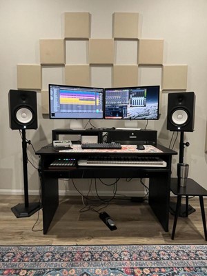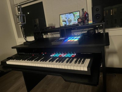 I looked at a lot of options for a studio desk and thought I would write this to help out others b/c it is hard to find a good fit. For me this desk is the perfect balance of being subtle enough to fit in a small home-music space, but large enough to be practical. My KRK Rokit 8 monitors fit (snugly) on the top shelf with a 27" iMac. The best feature for me is the slide-out keyboard tray which easily fits my 61 key Axiom keyboard. I was pleasantly surprised with the quality of the keyboard sliders, they work well. Also, you do not have to install the top shelf if you want to keep your monitor lower (I did install the rack shelf, but may remove). The only complaint I have with these types of desk is the monitor is too high for my tastes.