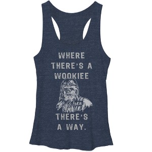 The fastest way to a wookiee's heart is with the Star Wars Wookiee Way Heather Navy Blue Racerback Tank Top. This soft and breathable tank top reads "Where there's a wookiee there's a way" next to an image of Chewbacca.