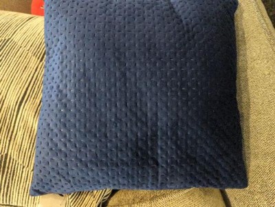 This pillow is legitimately 18x18, standard for a throw pillow. The material is soft and velvety, and has a slight sheen to it. There is a small design that looks like a separated plus sign where each plus is about 3/4 inch square. The pillow is a case with a zipper (for ease of washing) with a standard white fluff filled pillow inside. It's more squishy than firm and, in my opinion, is a true navy blue. I think this will be great as a decoration or to add a little squish when laying on my sofa.