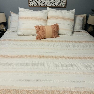 [This review was collected as part of a promotion.] This comforter set is so beautiful. Material is so soft and feels very comfortable and cozy while using it. This is a 3 pc queen size comforter set that comes with comforter: 90"H x 94"W and two shams: 20"H x 26"W. Material is linen, cotton and it is machine washable. Love design and color, so different and unique and fits my style. It is a high-quality set, even after many washes material didn't shrink and still looks like a new one.