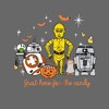 This adorable Star Wars Halloween Juniors' Tee features all your favorite Droids ready for some treats with the phrase "Just Here for the Candy" in a cute cursive font below.