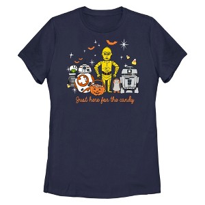 This adorable Star Wars Halloween Women's Tee features all your favorite Droids ready for some treats with the phrase "Just Here for the Candy" in a cute cursive font below.