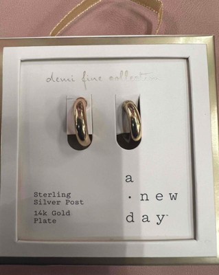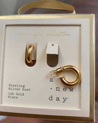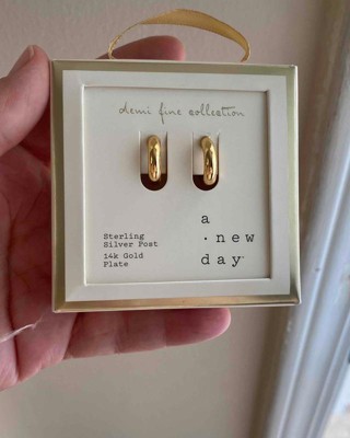 Add polish to almost any outfit with the subtle style of these 14K Gold Plated Tube Hoop Post Drop Earrings from A New Day™. Featuring nickel-free metal construction and sterling silver posts, these dainty hoop earrings boast a tube-style design and a 14K gold plated coating for a shiny, polished look. The 0.64-inch drop adds elegance to a variety of necklines and outfits, while also keeping the look simple enough to pair with everyday outfits like a T-shirt and jeans.