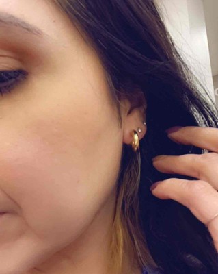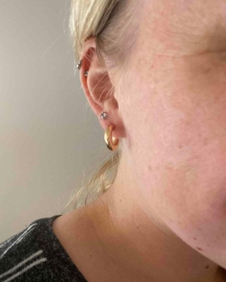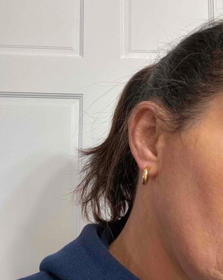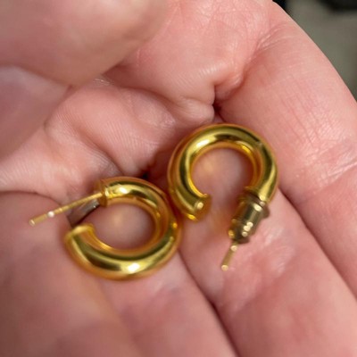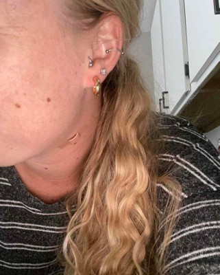 Love these earrings! I wanted an inexpensive hoop that I wouldn’t have to take out every night and these are great. They still look brand new, even after snorkeling in the ocean and my daily showers. Only complaint is the earring backs aren’t gold plated so they’ve started to tarnish.