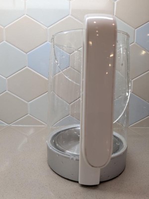 The water container's glass body cracked around the handle when I gently inserted the lid after cleaning. Regular descaling proves essential as mineral build-up forms directly above the heating element after a few days, despite our extensive water filtration system. Ultimately, we like the look and function of the kettle and have decided to replace it with the same model.