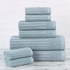 Create a spa-like oasis in your bathroom with our Ribbed Cotton 8 Piece Towel Set by Blue Nile Mills. This luxurious collection includes 2 bath towels, 2 hand towels, and 4 washcloths, all crafted from 100% absorbent cotton with a stylish ribbed texture and checkered border. Available in a wide array of vibrant colors, this luxurious towel set complements any decor style, from modern to traditional. The medium-weight terry loop weave ensures quick drying and long-lasting durability, while the STANDARD 100 by OEKO-TEX certification guarantees they are free of harmful substances and produced sustainably. Indulge in the plush comfort and exceptional absorbency of this towel set for a truly pampering experience.