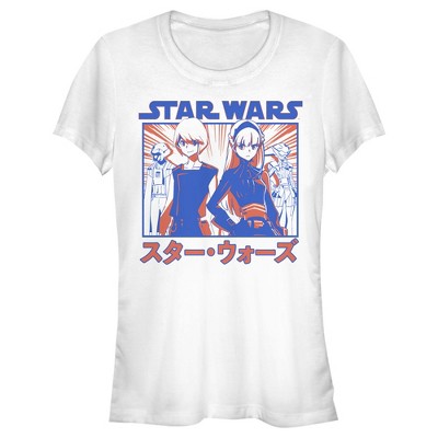 Characters from the episodes "Tatooine Rhapsody", "The Twins", "The Duel", "The Elder", and "Lop and Ocho" of the anime series Star Wars: Visions are featured across the front of this new officially licensed Juniors' Tee.