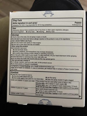 [This review was collected as part of a promotion.] This is an easy way to treat seasonal allergies! Treats anything from hay fever or any upper respiratory symptoms I hate taking a lot of pills cause they tend to be hard on my stomach. This bottle has 120 sprays and the man ingredient is azelastine. Works fairly well for me and its alcohol and fragrance free