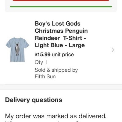 Fifth Sun a secondary seller at Target showed delivery date of 12/24 which is the only reason I ordered this particular t-shirt since a penguin shirt was a request of an 8 year old on his Christmas list to Santa. Didn’t receive the shirt until 12/27 so had to explain to a child why Santa didn’t get his shirt to him on Christmas morning! Not a happy grandma!