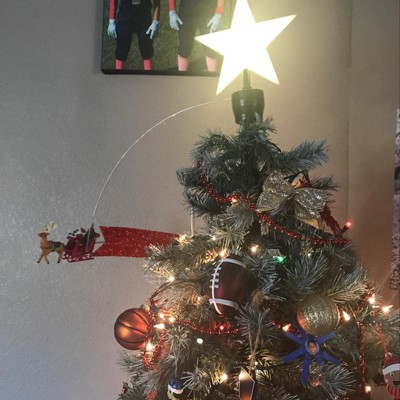 Animated Santa with a festive banner circles around an illuminated star as a fun Christmas tree topper