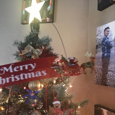 Santa and his reindeer have made their way to your home in the Santa Animated Tree Topper by Mr. Christmas. This beautiful tree topper easily attaches to any tree real or artificial with an included simple mount that uses Velcro straps to hug the center trunk. Following Santa is a 12.5" long red glittery banner displaying a holiday message. Three-dimensional Santa and reindeer carrying gifts and miniature tree are brought to life with vibrant colors and highly detailed craftsmanship. This festive Christmas tree decoration measures approximately 20" tall from base to the top of the star, making a significant presence on any size tree. Plugin using the AC adapter and watch Santa circle continuously around the LED illuminated 8" shining star. You can now enjoy this fun holiday decor item with or without animation by selecting the light only feature, so you can choose when you want Santa to begin a new journey around the tree.
