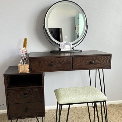 Costway Vanity Table Stool Set Dimmer LED Mirror Large Cabinet Drawer Rustic Brown