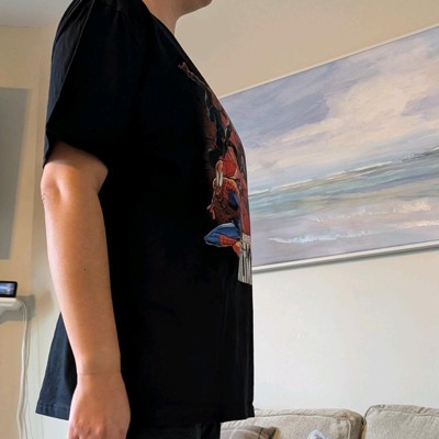 I ordered this item as a present so I tried it on myself for the pictures. I typically wear a medium in women's shirts and an wearing a men's large here. It seems to run true to size and will fit the gift recipient. It's a great quality T-shirt. The graphic looks great in person. My kids were so excited about the Spider-Man